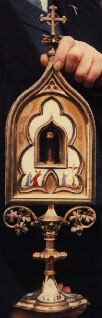 Sometime later a new crystal tube was designed for the relic. At either end are rings of gold and copper, with a cross surmounting the top. The tube, with the cloth clearly visible, is sealed and kept within a special ostensorium. This is adorned at its base with four enamel panels which depict events in the history of the relic.